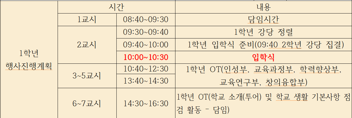 1. 등교 시각: 3월 3일(화) 08:30까지 교실 입실 완료(1학년 교실은 2층에 있음)