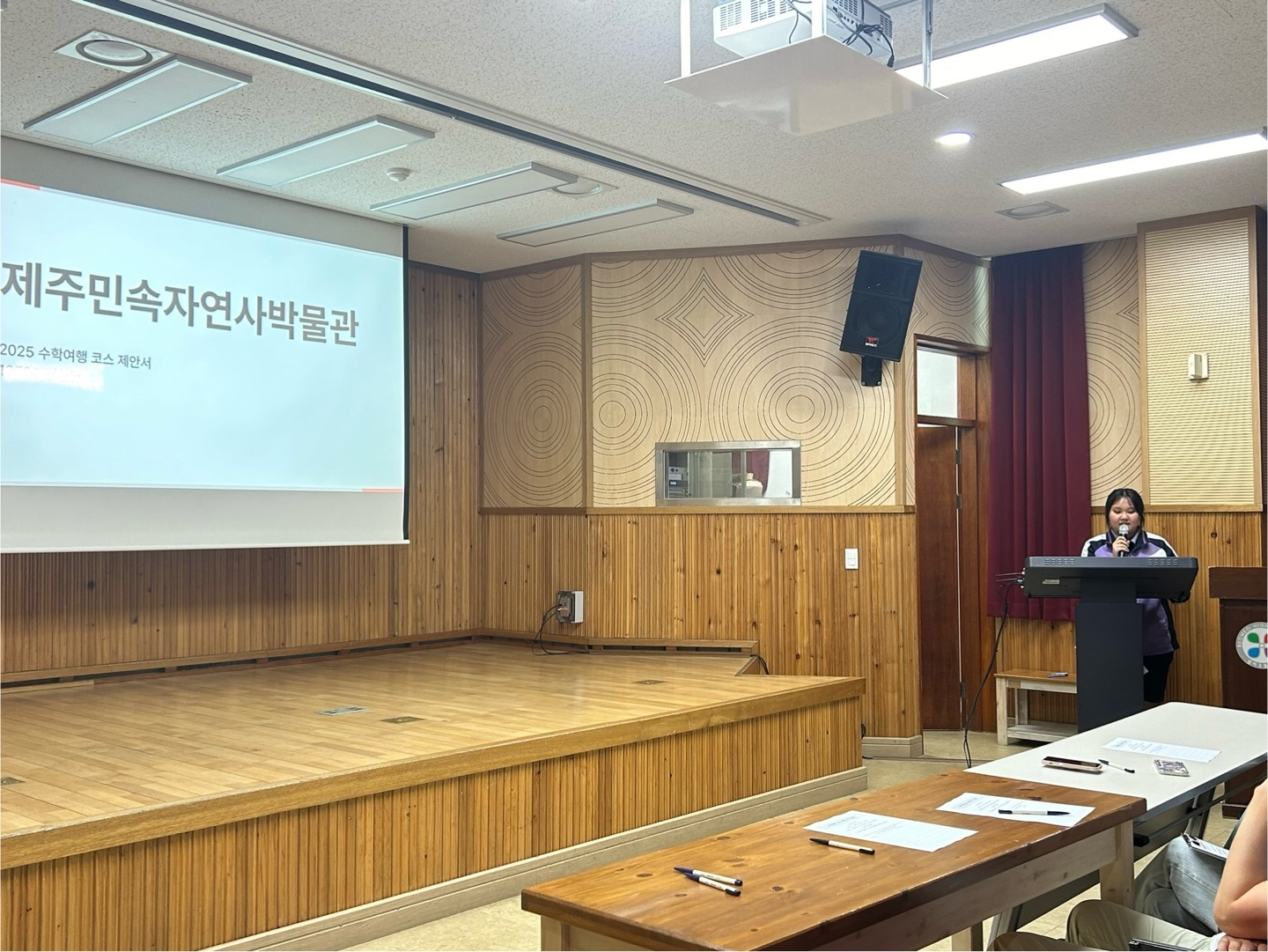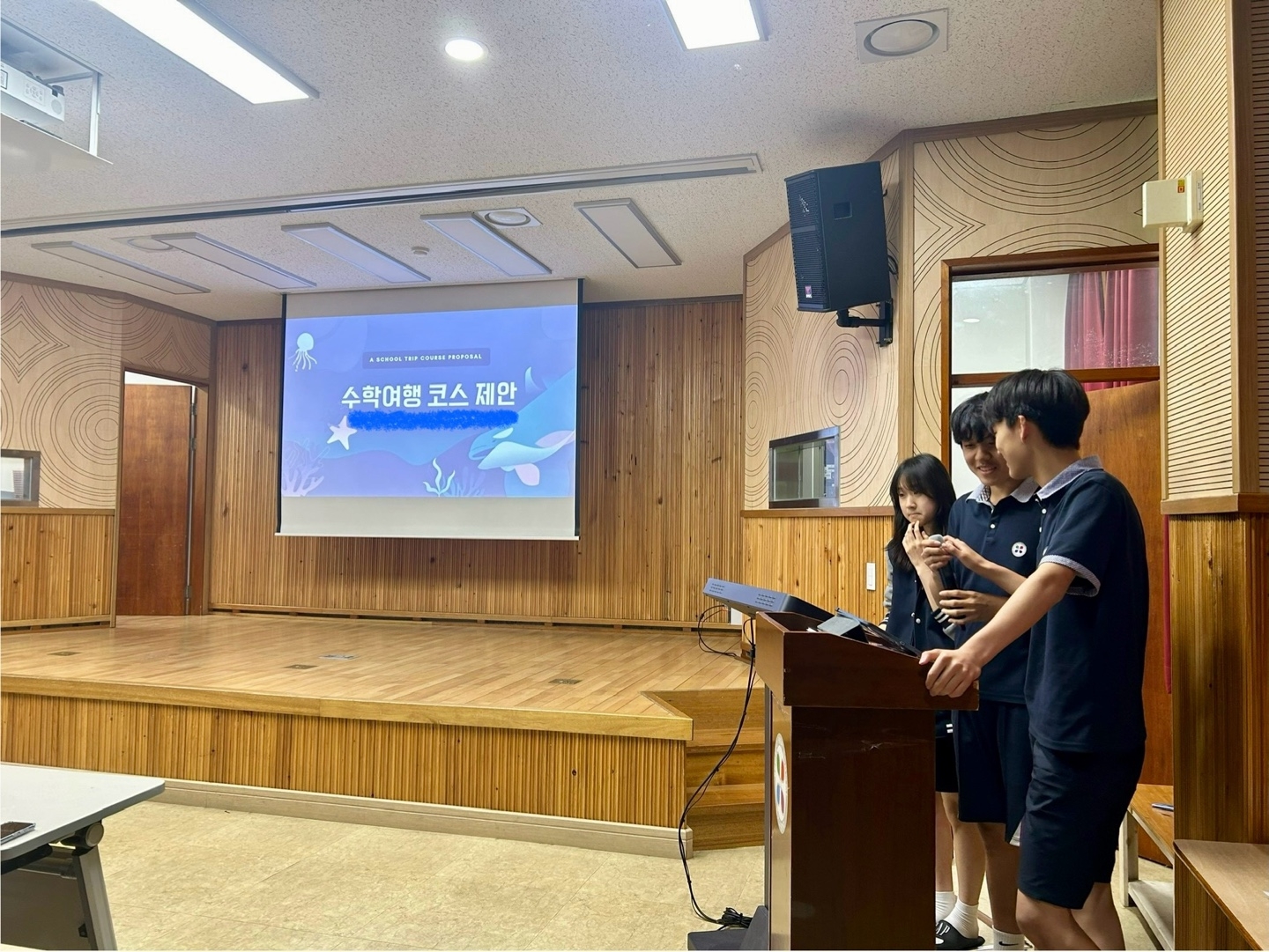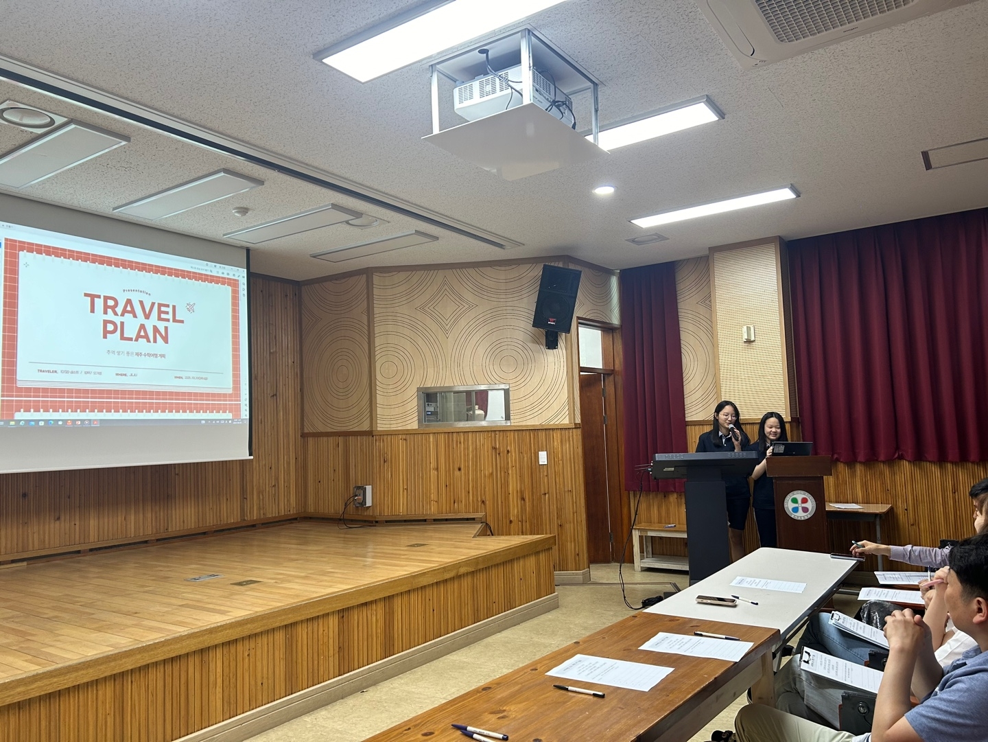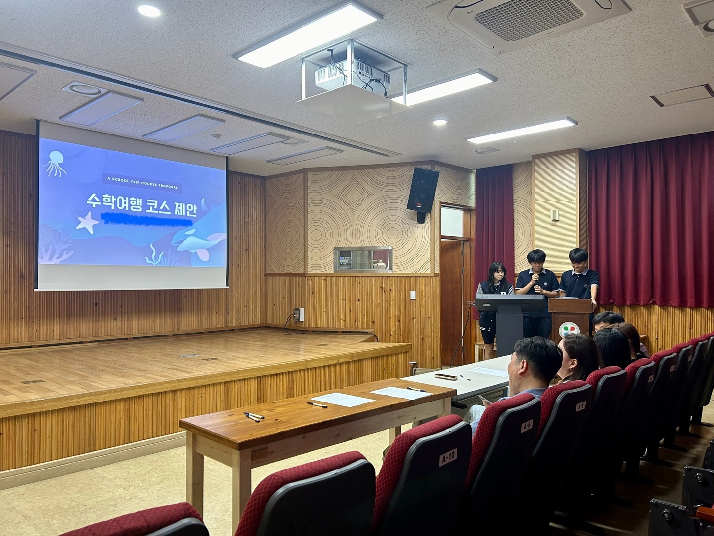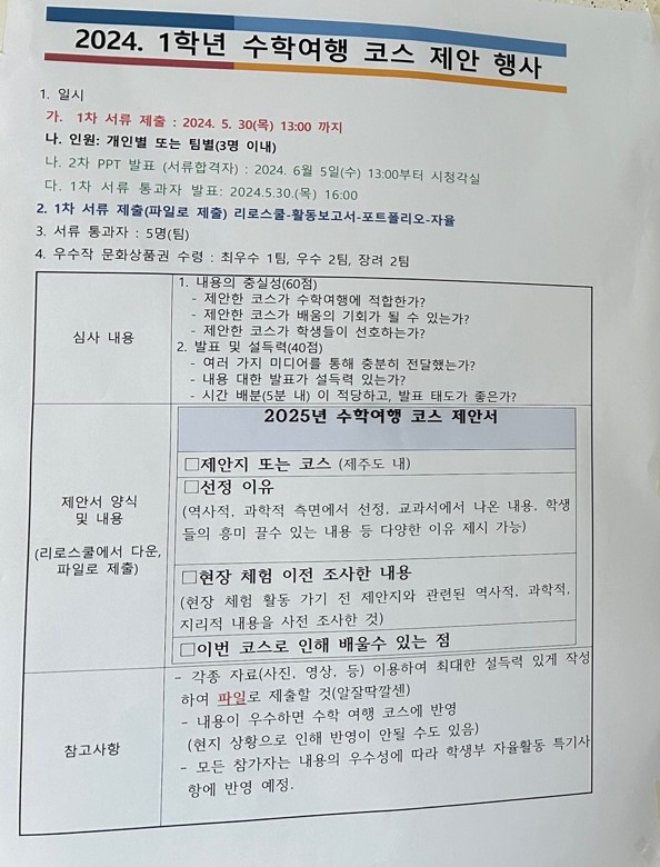 * 수학여행 코스 제안서 1차 서류 통과한 다섯 팀의 학생들이 피티 발표를 했습니다.